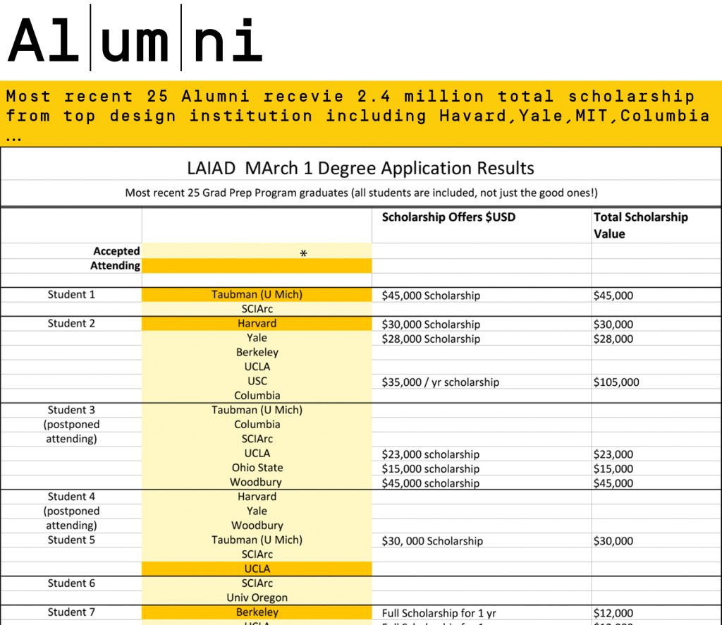 We offer an internship program and interior design school whereby many of our students are placed as interns in the offices of some of the top architects and designers in Los Angeles. Internship opportunities are subject to availability, but many of our students have worked in one or more architecture or design offices during their studies at LAIAD.