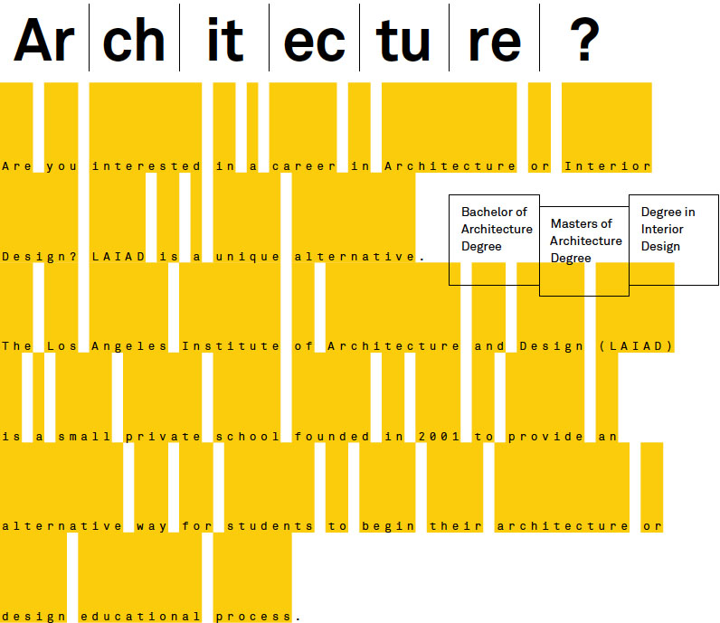 Are you interested in a career in Architecture or Interior Design? LAIAD is a unique alternative. The Los Angeles Institute of Architecture and Design (LAIAD) is a small private school founded in 2001 to provide an alternative way for students to begin their architecture or design educational process.