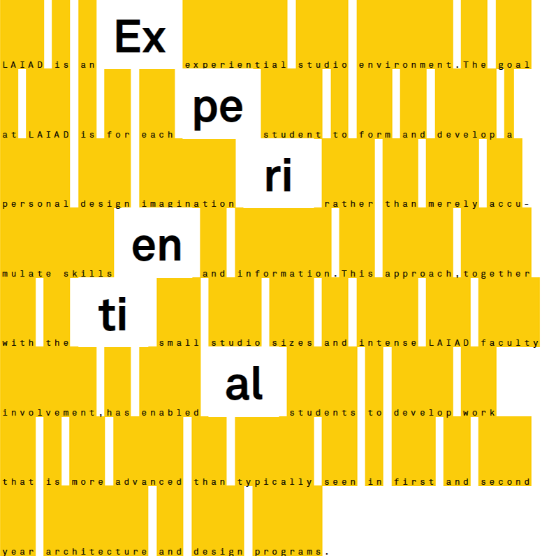 LAIAD has very small class sizes (6-12 students) as well as personally designed studio programs. This allows us to adapt projects to each individual student’s interests and abilities and allow students to focus on the development of their own personal design process.