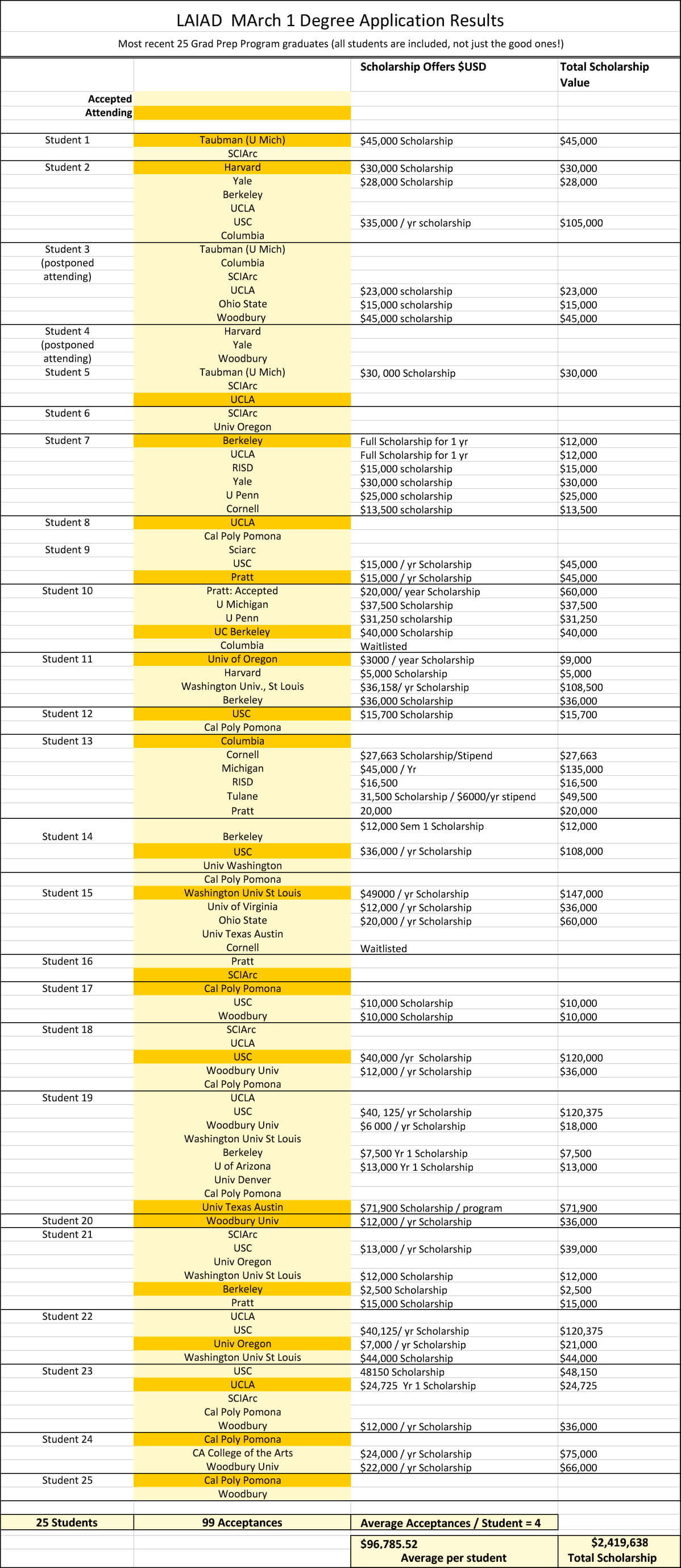 Currently, our undergraduate transfer program students are successfully transferring with advanced placement into leading architecture and design schools such as SCI-Arc, Pratt, Woodbury, Cal Poly Pomona, UCLA and Otis Art Institute, among others, and our graduate preparation students are being accepted (some with substantial scholarships) at Harvard, MIT, Yale, Penn, Columbia, Pratt, USC, University of Michigan, RISD, UCLA, SCI-Arc, and Cal Poly Pomona, among others.